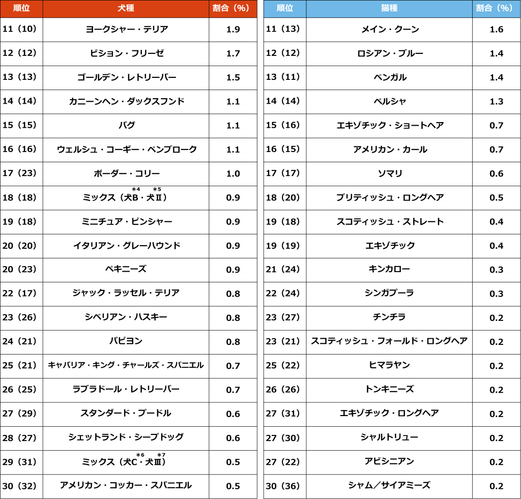 11位から30位では、シャム(サイアミーズ)が昨年の36位から30位にランクインしています。