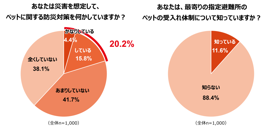 調査によると、ペットの防災対策を十分に行っている飼い主さんはわずか20.2%。また、近所の避難所が「ペットを受け入れてくれるか」を知らない人は約9割にものぼりました。