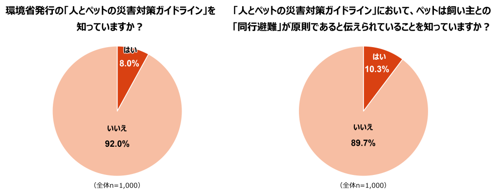 環境省発行の「人とペットの災害対策ガイドライン」では、災害時には飼い主がペットと一緒に避難する「同行避難」が原則とされています。しかしその存在を知っている飼育者はわずか8.0%でした。