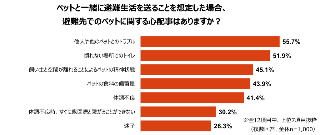 避難先での心配事は「他人や他のペットとのトラブル」が55.7%で最多となり、次いで「慣れない場所でのトイレ」が51.9%にのぼりました。