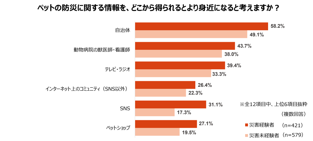 ペット防災の情報を得られるとより身近になる窓口は「自治体」が最多で、次いで「動物病院の獣医師・看護師」や「テレビ・ラジオ」が上位を占めました。