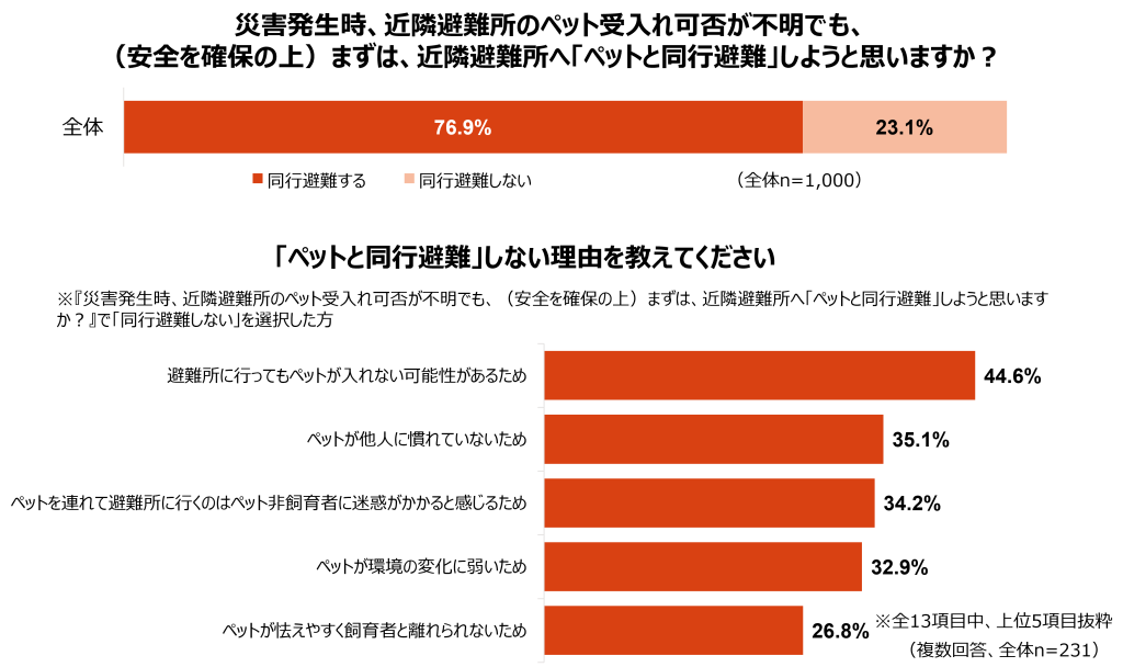 災害時の同行避難に関する意向調査では、76.9%の飼育者が「同行避難したい」と高い意欲を示している一方、多くの飼い主さんが「避難所に行ってもペットは入れないのでは?」という不安(44.6%)を抱えているようです。