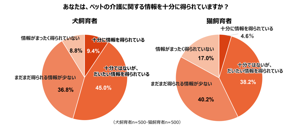 ペットの介護に関する情報では、犬の飼育者で「十分に情報を得られている」と回答した方は9.4%で、45.6%は「まだまだ得られる情報が少ない」または「情報がまったく得られていない」と回答しました。