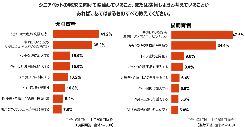 シニアペットの将来に向けての準備では、犬と猫で差が見られました。