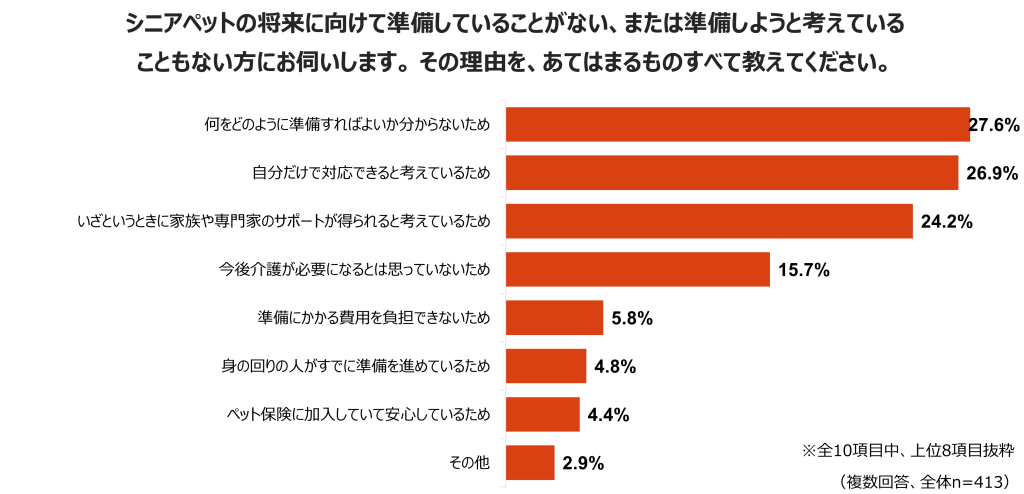 シニアペットの将来に向けて「準備していることも準備しようと考えていることもない」と回答した飼育者の理由については、犬・猫ともに大きな差はなく、「何をどのように準備すればよいか分からないため」が最多の27.6%でした。